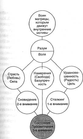 В этот момент Томасу назначают в матрице свидание, и Тринити и двое других волшебников (Свитч и Апок) подбирают его. Он проходит через болезненную и унизительную процедуру «очистки», во время которой из него извлекают «жучка». Еще до этого, в ответ на подозрение Томаса Свитч отвечает ему как истинный воин: «Выбирай одно из двух: слушайся или топай». Томас решает уйти (ему мешает самомнение), но Тринити вновь взывает к его глубинному желанию, и Томас позволяет себя убедить. Его приводят к Морфеусу, провидцу, человеку знания и королю волшебников. Тринити дает простой совет: «Не хитри. Он знает практически все». Морфеус входит в 1-е внимание, но не теряет связи и со вторым и тем самым демонстрирует искусство сталкинга. Сталкинг (см. Словарь) известен также как искусство контролируемой глупости. Это не хищническое, а стратегическое поведение, которое влечет за собой постоянное и тщательное наблюдение за всеми без исключения событиями в жизни воина матрицы, включая мельчайшие подробности. Воины матрицы в совершенстве осваивают все правила и обычаи матрицы (1-е внимание) независимо от того, относятся ли они к тем существам, с которыми воины взаимодействуют, или к ним самим. Научившись точно предсказывать действия (свои собственные и других), они их «сталкируют», то есть выслеживают и эффективно используют. (Собственно говоря, воины матрицы «сталкируют» энергию.) Этот метод они прежде всего применяют к своим мыслям, действиям и чувствам, а уже затем к действиям и реакциям тех, кто их окружает. Воины матрицы, овладевшие искусством сталкинга, имеют перед своими собратьями хуматонами заметное преимущество: они видят их действия насквозь. Как и в случае с Морфеусом, они как бы снаружи разглядывают то, что происходит внутри, или с вершины смотрят вниз. Все действия и обстоятельства как бы развертываются по точно намеченному плану, видеть который доступно только им. Тем не менее они активно участвуют во всем происходящем, и может даже показаться, что они страстно в него вовлечены. Но это только видимость. Поскольку им известно, что все происходящее нереально, у них совершенно иная, чему хуматонов, мотивировка.