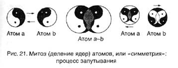 Ученые знают об этом, потому что они это наблюдали, и назвали «симметрией». Для простоты скажем, что при встрече атом А и атом В обмениваются блоками информации х и у. Атом А отдает часть своего х атому В,а тот, в свою очередь, передает часть своего у этому молодому быстрому атому, по счастью, повстречавшемуся ему на пути. Итак, атом А уносит с собой пропорциональное количество х- и у-энергии, то же самое касается атома В. Если дальше в нашей космической сказке у атома В изменится «спин» из-за того, что вся его y-энергия преобразовалась в x-энергию, то атом а тоже изменит свой «спин» и полностью преобразует свой информационный багаж в у. Таким образом между ними сохраняется симметрия.