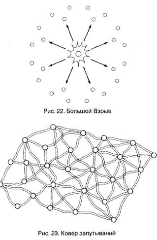 После «Большого взрыва» эти частицы были рассеяны и отправлены каждая со своей миссией, накапливать и распространять опыт (если хотите, через митоз атомов) среди всех подходящих для этого частиц. Так создается «ковер запутываний», благодаря чему все некогда объединенные частицы можно будет объединить вновь, только на этот раз в виде огромного и беспредельного пространства космических взаимоотношений. Начиная с этого момента вселенная отдельных частиц вновь начнет процесс собирания, свертывания. Разве цель нашего существования не в том, чтобы проходить опыт раздельного существования до тех пор, пока всех нас не объединит один завершающий опыт Единства? Этого мнения придерживается церковь, а теперь и ученые выдвигают точно такую же гипотезу: «большое сжатие» — это ответ на «Большой взрыв». Но если так поступают частицы, то что же тогда остается делать людям?