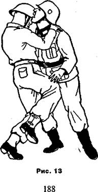 1. Перенося вес своего тела на одну ногу, согните вторую ногу в колене, слегка оттягивая пятку назад и максимально быстро нанесите удар коленом вверх, в пах противника (рис. 13).