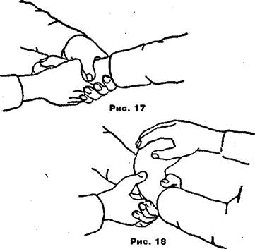 1. Противник захватил вашу правую кисть, как показано на рисунке 15. Согните кисть в запястье и руку в сторону от своего тела, одновременно поворачивая запястье на внешнюю сторону против большого пальца противника (рис. 16).