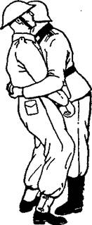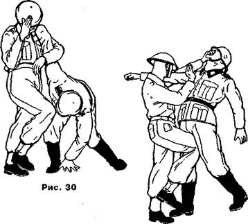 Примечание. Если противник предвидит ваши намерения, когда вы находитесь в положении, показанном на рисунке 29, и сопротивляется оказываемому вами давлению левой рукой, нанесите ему удар левой рукой по глазам, как показано на рисунке ЗОА. Завершите комбинацию ударом колена в пах.