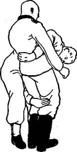 Примечание. Если вы правильно выполните все указания, то удивитесь, насколько легко можно поднять человека, который весит гораздо больше чем вы. При выполнении данного приема отчасти помогает то обстоятельство, что противник инстинктивно хватается за вас одной или двумя руками. Если вы вкладываете вес своего тела в удар вниз, он не может помешать намерению сломать ему позвоночник.