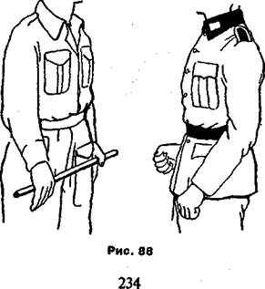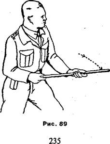 2. Удерживая палку правой рукой, взмахните ею и захватите другой ее конец левой рукой примерно в 6 дюймах (15 см) от края. Это движение следует выполнять, не опуская взгляда на руки или палку. Обратите особое внимание на положение рук (рис. 87).