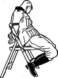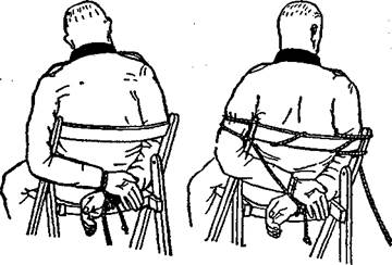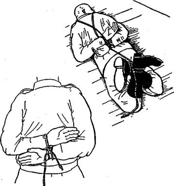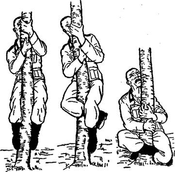 Примечание. Несмотря на то, что руки пленного останутся свободными, при правильном выполнении этого приема убежать он не сможет. Обычно у среднего человека, находящегося в таком положении, через 10—15 минут затекают ноги, и вероятность того, что он сможет самостоятельно вернуться в исходное положение, равна нулю. Чтобы освободить пленного, потребуются два человека, которые с каждой стороны возьмут его за ноги и поднимут вдоль дерева, а затем раздвинут ему ноги.