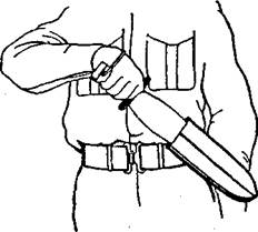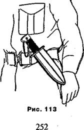 1. Тесак обычно носят в ножнах на левой стороне ремня, как показано на рис. 113. Это позволяет солдату бегать, лазать, сидеть и лежать.