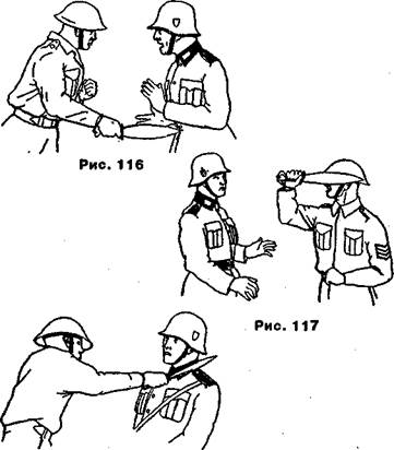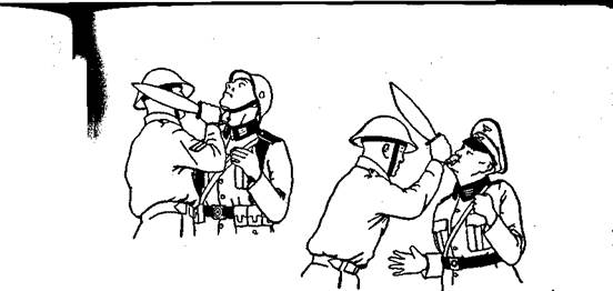 | Удары в ближнем бою 1. Вонзите тесак глубоко в живот противника (рис. 116). 2. Нанесите «сабельный удар» в правую нижнюю часть шеи (рис. 117). 3. Нанесите «сабельный удар» тесаком в нижнюю левую часть шеи (рис. 118). 4. Нанесите сильный удар рукояткой тесака снизу в подбородок (рис. 119). 5. Нанесите сильный удар рукояткой тесака сверху вниз в лицо противника (рис. 120). |