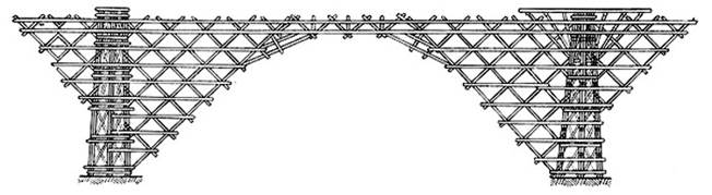 В 1869 году на Николаевской железной дороге сгорели три (из девяти) деревянные фермы Мстинского моста. Восстановление их было трудным делом, так как по условиям ледохода невозможно было устраивать кустовые подмости. Руководитель работ Д. И. Журавский спроектировал подмости в виде подкосных ферм веерной системы с противовесными малыми веерами без промежуточных опор (рис.2.3). Этим решением спустя 15 лет воспользовались англичане при постройке Аттокского моста через реку Инд, но они не сослались на приоритет Д.И Журавского [2.23].