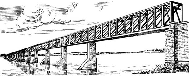 К концу XIX века количество железнодорожных металлических мостов в России превышало сотни, причем многие из них были уникальными; например, мост через реку Волгу у Сызрани (рис. 2.4), открытый для движения в 1880 году, который состоял из 13 пролетов по 106,5 м длиной каждый. Это был самый длинный мост Европы.