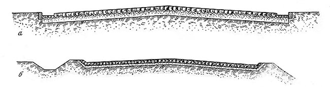 В строительстве земских грунтовых дорог применялись два типа поперечных профилей (рис. 2.12): обычный, наиболее распространенный, и лотковый, менее распространенный. В сравнении с шоссе поперечные уклоны грунтовых дорог были более крутыми, в пределах 0,03 - 0,06. Хотя правила предписывали принимать для земских дорог продольные уклоны и радиусы закруглений такие же, как и для казенных шоссе, но фактически для земских дорог допускались продольные уклоны в пределах 0,08 - 0,10 и больше, а радиусы кривых 21 - 22,4 м. Подобное "облегчение" технических правил было и для других элементов грунтовых и шоссейных дорог (уменьшение ширины проезжей части, толщины щебеночного слоя и др.). Более того, подобные свободы коснулось и основных принципов проектирования трассы. Так, с 70-80-х годов стали отказываться от принципа проектирования трассы дороги по кратчайшему направлению и начали переходить к проектированию гужевых дорог с кривыми в плане и в профиле. Это объяснялось необходимостью сокращения издержек на строительство и ремонт дорог.
