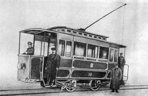 Первые трамвайные вагоны были несовершенными, в большинстве случаев переделанными из вагонов конки; они имели всего 12 мест для сидения. Силовое оборудование состояло из одного мотора постоянного тока мощностью 4,5 л. с. Управлялся такой вагон с помощью реостата, установленного на площадке.