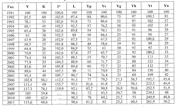 *) Y - индексы физического объема валового внутреннего продукта, Kt – индексы объема инвестиции в основной капитал, I – индексы изменения основных фондов на конец года (в сопоставимых ценах), L – индексы численности занятого населения, Yp – индексы объема продукции промышленности, Ys – индексы объема продукции сельского хозяйства, Yg – индексы объема перевозок грузов предприятиями транспорта, Yh – индексы объема перевозок пассажиров предприятиями транспорта, Yt – индексы физического объема розничного товарооборота, Yn – индексы физического объема платных услуг населению по предприятиям.