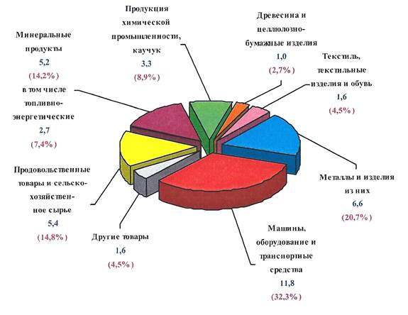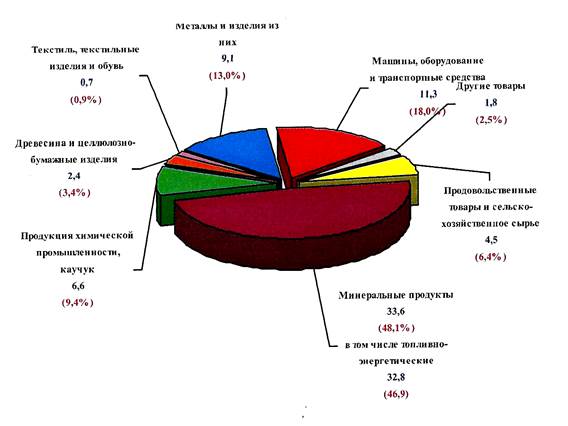 (млрд. долларов США, в % от общего объема экспорта РФ в СНГ)