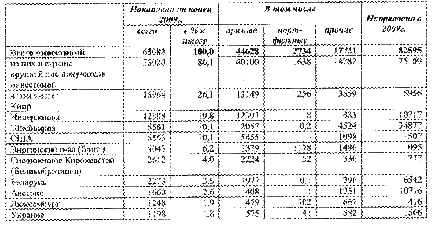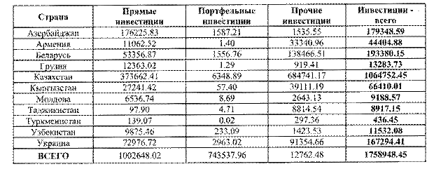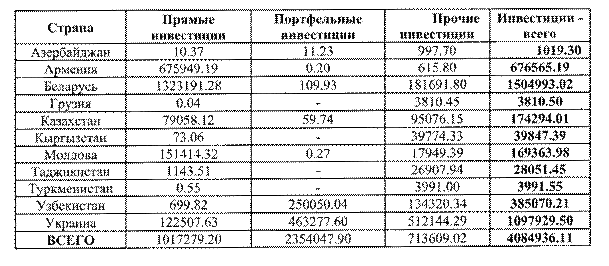 Важной составляющей торгово-экономических отношений РФ со странами СНГ и показателем эффективности интеграционных процессов являлось инвестиционное сотрудничество. Объем накопленных российских инвестиций в странах СНГ, на конец, 2008 года превысил 4,0 млрд. долл., а объем накопленных инвестиций стран СНГ в экономику России составил около 1,8 млрд. долл. (табл. 4.9-4.10).