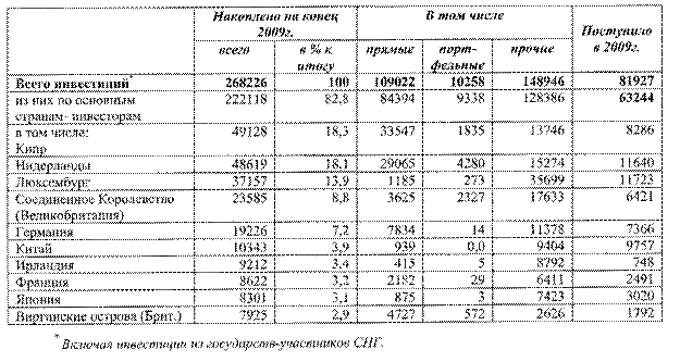 По состоянию на 2010 год, накопленный иностранный капитал в экономике России составил 268,2 млрд. долл., что на 1,4% больше, чем в 2008 году. Наибольший удельный вес в накопленном иностранном капитале приходился на прочие инвестиции, осуществляемые на возвратной основе - 55,5% (на 2008 год - 51,6%); доля прямых инвестиций составила 40,7% (46,3%), портфельных - 3,8% (2,1%) (табл. 4.11-4.12).