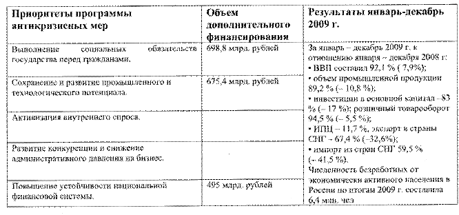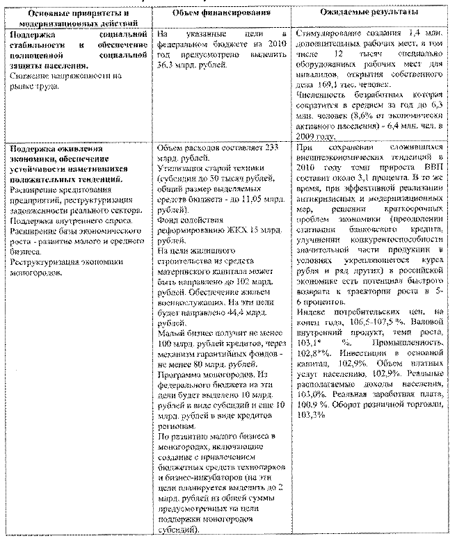 Основные направления антикризисных действий на 2010 год были представлены Правительством РФ 30 декабря 2009 года (табл. 4.15-4.16).