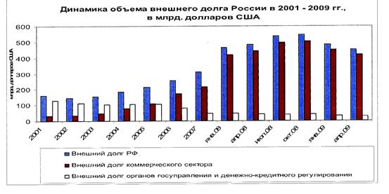 3. Опасно возросший частный внешний долг. В результате масштабного привлечения финансовых ресурсов из-за рубежа коммерческая задолженность корпоративного сектора стала расти быстрыми темпами. Если за последние три года в России существенно сократился объем государственного внешнего долга, то долг корпоративного сектора за это же время существенно возрос (рис.4.18). В результате частный внешний долг стал основным детонатором влияния мирового кризиса на российскую экономику, поставив на грань банкротства отдельные российские банки и компании.