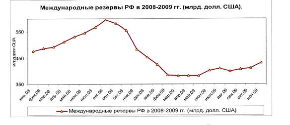 также создало дополнительные стимулы для притока в будущем иностранного капитала в форме прямых инвестиций. Однако плавная девальвация усилила панические настроения на рынке и привела к значительному снижению золотовалютных резервов. За период с 1.08.08 по 1.04.09 годы золотовалютные резервы РФ (ЗВР) уменьшились на 35,7% или на 212,8 млрд. долл. (с 596,6 до 383,8 млрд. долл.) (рис. 4.23). Кроме того, неопределенность в отношении валютного курса практически заморозила активность кредитных институтов.