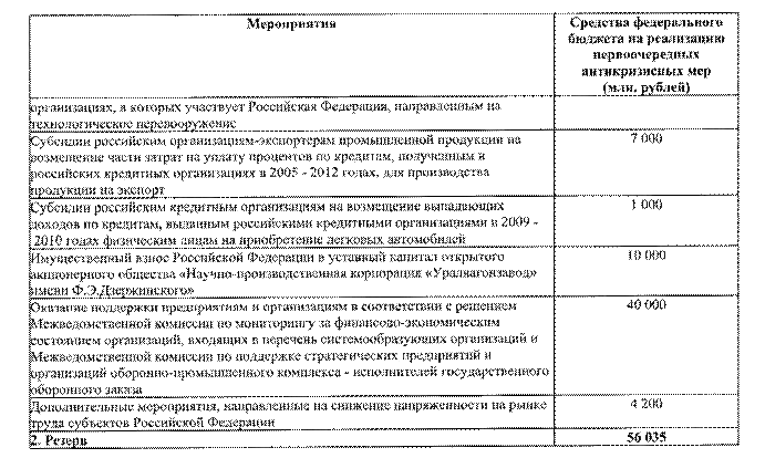 1. Основные антикризисные меры в России нашли отражение в бюджетной политике и значительно увеличили расходную часть бюджета 2009 года. Основой скорректированного бюджета стало полное обеспечение всех социальных обязательств государства.