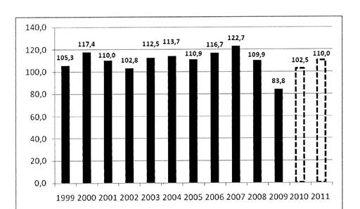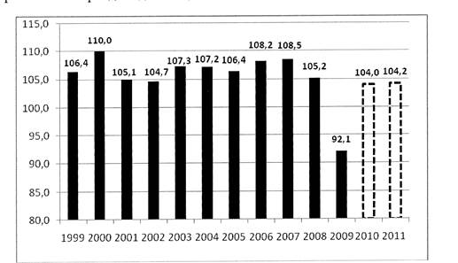 Актуальный прогноз предполагает рост данного показателя на 2,5% по итогам 2010 года и на 10% в 2011 году.
