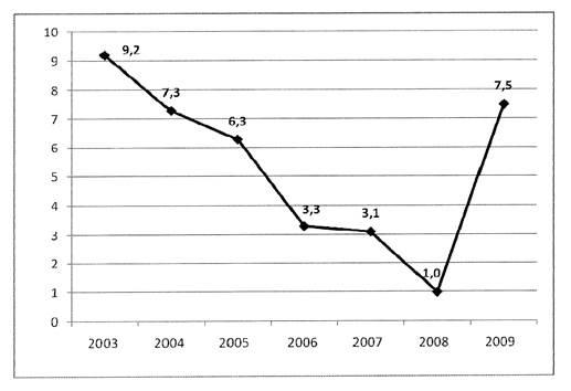 признать удачной. В 2009 году российская экономика сократилась по сравнению с 2008 на 8,9%; промышленное производство – на 11,0%; инвестиции – на 18,6%. Поступление иностранного капитала сократилось на 31%. К началу 2010 года без работы осталось более 7,6% трудоспособных россиян (5,6 млн. чел.).