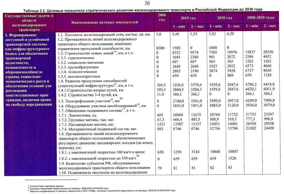Целевые показатели по вариантам стратегического развития железнодорожного транспорта в РФ до 2030 года, характеризующие достижения поставленных целей и решения государственных задач, представлены в табл. 2.2 «Стратегии …».