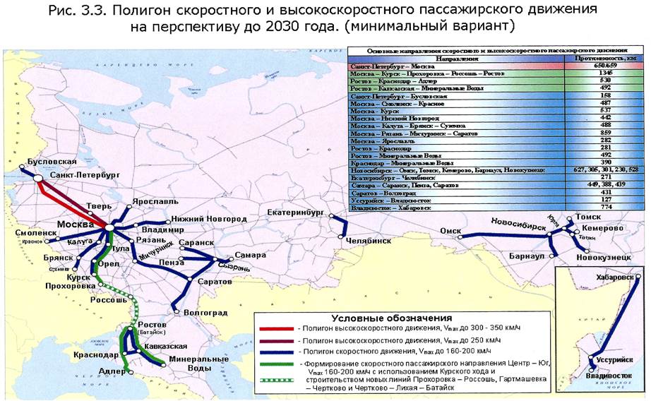 2. Организация скоростного движения между крупными региональными центрами поездов со скоростями до 160-200 км/ч. Общая протяженность скоростного полигона железных дорог России составит более 10 тыс. км;