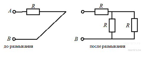 Рассмотрим левую половинку схемы после замыкания ключа. Она представляет собой параллельное соединение резистора с сопротивлением R и соединительного провода с пренебрежимо малым сопротивлением. Поэтому по правилу подсчета общего сопротивления параллельно соединенных проводников получаем, что сопротивление левой половинки равно