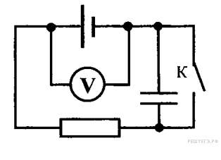 Поскольку показания вольтметра, подсоединенного к источнику меняются при замыкании ключа, это означает, что источник не идеальный, и его внутренне сопротивление отлично от нуля. Показания во втором случае меньше, так как через источник начинает течь ток, и часть напряжения падает на внутреннем сопротивлении. В первом же случае, тока в сети нет. Более точно говоря, ток был, пока происходила зарядка конденсатора, но после того, как конденсатор зарядился, ток прекратился. А значит, в первом случае, вольтметр показывает ЭДС источника. Она равна 8 В.