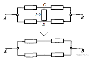 , а значит, ток по вертикальной перемычке по закону Ома, не потечет (так как напряжение на ней равно нулю: