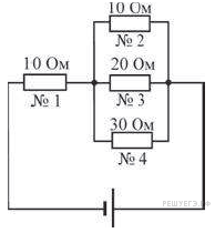 Схема представляет собой параллельное соединение резисторов №2, №3 и №4, к которым последовательно подключен резистор №1. При последовательном подключении сила тока одинаковая. При параллельном соединении сила тока делится между резисторами таким образом, чтобы напряжения на всех резисторах было одинаково. Следовательно, максимальный ток течет через резистор №1.