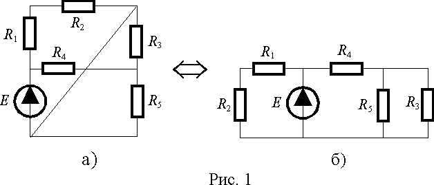 Узел не обязательно имеет вид точки. На рис. 1 б) вся нижняя линия связи, соединяющая R 2, E, R 5 и R 3 , является узлом, а на рис. 1 а) этот же узел представлен диагональной связью.