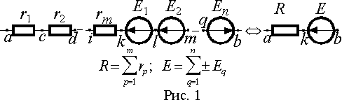 В последовательное соединение в общем случае может входить любое количество резисторов и источников ЭДС (рис. 1), но не может входить более одного источника тока, т.к. это противоречило бы свойству каждого из источников создавать в цепи ток не зависящий от внешних элементов.