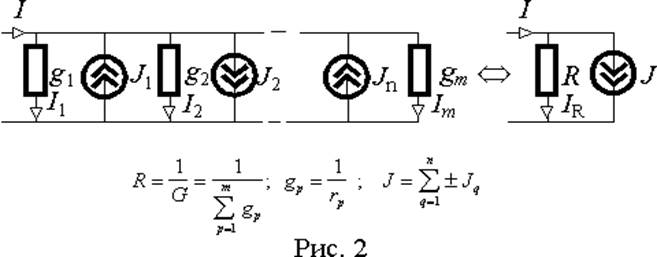 Таким образом, параллельное соединение любого количества элементов можно преобразовать к параллельному соединению одного эквивалентного резистора и одного источника тока. Причем, сопротивление эквивалентного резистора равно величине обратной сумме всех проводимостей резисторов входящих в соединение, а ток эквивалентного источника равен алгебраической сумме токов источников входящих в соединение.