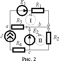 При выборе контуров и составлении уравнений все ветви с источниками тока должны быть исключены, т.е. контуры обхода не должны включать ветви с источниками тока. Это не означает что для контуров с источниками тока нарушается второй закон Кирхгофа. Просто при необходимости определения падения напряжения на источнике тока или на других элементах ветви с источником тока это можно сделать после решения системы уравнений. Например, на рис. 2 можно создать замкнутый контур из элементов R 3, R 4, J и E 2, и для него будет справедливым уравнение