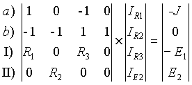 Каждая строка матрицы A должна соответствовать одному из уравнений (7)-(10). Поэтому в строки матрицы A нужно включить все коэффициенты при токах соответствующего уравнения, в той последовательности, в какой эти токи включены в координаты вектора неизвестных величин. Если какой-либо ток отсутствует в уравнении, то в качестве элемента матрицы нужно указать нуль. Для включения в матрицу уравнения по первому закону Кирхгофа удобнее записывать в форме (1) с нулевой правой частью, однако, для уравнения (7) нужно перенести ток источника J в правую часть, т.к. он не входит в число неизвестных.