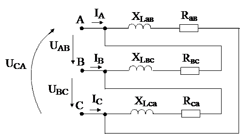 Известны сопротивления симметричной трехфазной цепи, соединенной треугольником Raв = Rвс = Rса = 12 (Ом); ХLав = ХLвс = ХLса = 16 (Ом). Линейное напряжение UЛ = 220 (В). Определите токи в линейных проводах.
