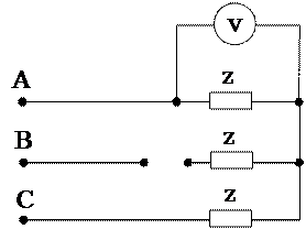 Что покажет вольтметр, включенный в цепь симметричного трехфазного потребителя, если линейное напряжение питающей сети равно U, а линейный провод «В» оборван? (рис.5.2.8).