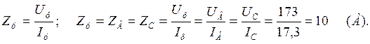 Фазные напряжения в фазах «в» и «с» выросли до линейных и стали равными по 173 (В), UВ = UС = 173 (В). Зная фазные токи и напряжения в режиме короткого замыкания в фазе «а», определим фазное сопротивление
