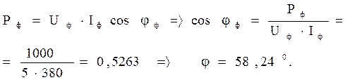 Из расчета видно, что между фазными током и напряжением существует угол сдвига фаз, равный 58,240, значит сопротивление фазное z носит активно-реактивный характер. Для определения характера реактивного сопротивления (емкостное или индуктивное данных в задаче недостаточно).