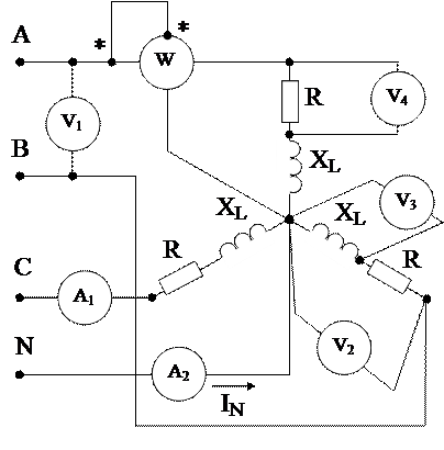 Задана схема трехфазной цепи с симметричной нагрузкой, соединенной звездой. Известны фазные сопротивления и линейное напряжение: R = 6 (Ом), XL = 8 (Ом), Uл = 380 (В). Определите показания приборов.
