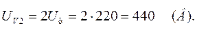 Вольтметр V1 подключен к началу и к концу одной фазы и измеряет фазное напряжение: Uф = 220 (В). Вольтметр V2 показывает напряжение, равное векторной сумме напряжений всех трех фаз: