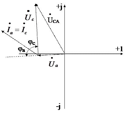 Рисунок 5.2.27 – Векторная диаграмма токов и напряжений при обрыве линейного провода «В» (несимметричная нагрузка)