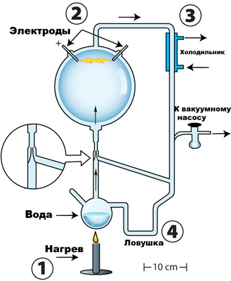 Прибор Миллера. Кипящая вода (1) создает поток пара, который усиливатся соплом аспиратора (врезка), искра, проскакивающая между двумя электродами (2), запускает набор химических превращений, холодильник (3) охлаждает поток водяного пара, содержащего продукты реакции, которые оседают в ловушке (4).// Нед Шоу, Университет Индианы.