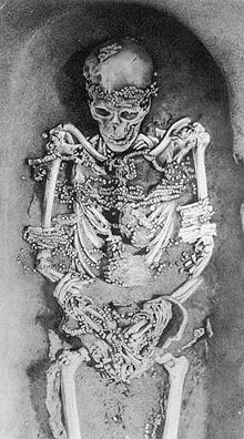 Хоронившие часто посыпали мертвых красной охрой, которая, как предполагают, символизировала кровь и жизнь, свидетельствовала о наличии у кроманьонцев веры в загробную жизнь. Некоторые трупы были захоронены с богатыми украшениями.