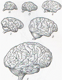 Высокоразвитый мозг. Мозг современного человека сильно отличается от мозга человекообразных обезьян (рис. 2.29.) по размерам, форме, строению и функциям, однако среди ископаемых форм можно найти множество переходных вариантов. Типичные признаки мозга человека следующие: