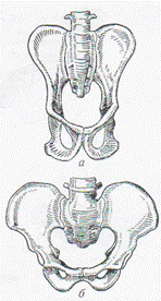 - строение таза - у прямоходящих таз широкий и низкий (такое строение известно начиная с Australopithecus afarensis 3,2 млн. лет назад), у четвероногих таз узкий, высокий и длинный (рис. 2.30.);