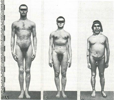 Отсюда в первом случае высокорослые относительно своего морфологического статуса женщины (165 см) будут иметь более длинные ноги по сравнению с мужчинами, для которых 165 см — средний рост, во втором — низкорослые мужчины (153 см) будут относительно коротконогими по сравнению с женщинами среднего роста. Если же сравнить мужчин и женщин, имеющих одинаковую длину корпуса (77 см; 71 см), то, как при больших, так и при малых его величинах женщины будут иметь более короткие ноги. Особенно сильно проявляется половой диморфизм в размере признака «рост сидя» (расстояние от верхушечной точки до плоскости сиденья). У женщин величина этого признака примерно на 5 см больше в основном за счет сильного развития жировой клетчатки в седалищной области.