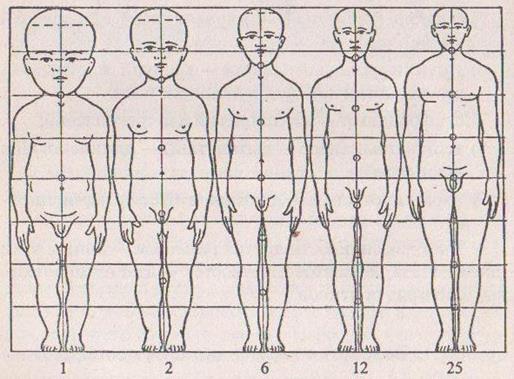 Всем известно, что новорожденные дети имеют относительно большую голову, длинное узкое туловище и короткие ноги. В процессе возрастного развития пропорции тела постепенно видоизменяются за счет разной скорости роста отдельных частей (рис. 4.2.).