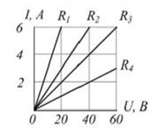 На рисунке приведены зависимости тока через резисторы от напряжения на них. Сопротивление